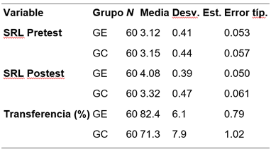 Tabla1. Estadísticas descriptivas de aprendizaje autorregulado (SRL) y transferencia del aprendizaje