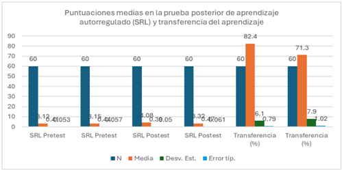 Gráfico 1. Puntuaciones medias en la prueba posterior de aprendizaje autorregulado (SRL) y transferencia del aprendizaje