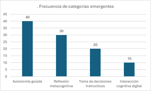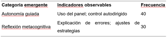 A partir de las observaciones en el aula, surgieron tres categorías centrales: (1) autonomía guiada, caracterizada por el uso activo de tableros cognitivos; (2) reflexión metacognitiva, manifestada en verbalizaciones como ‘sé dónde fallé y las razones por las que’; y (3) toma de decisiones instructiva, evidenciada por la auto-selección de tareas personalizadas. Estos rasgos están en línea con investigaciones que afirman que los entornos inteligentes mejoran la autorregulación (Moreira-Fontán et al., 2023).